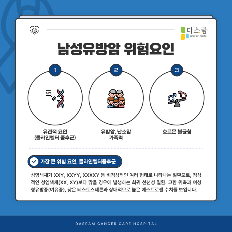 남성유방암은 여성유방암과 다르게 유전적인 요인이 크게 작용하는데요. 유전 질환인 클라인펠터(Klinefelter)증후군이 남성유방암의 가장 큰 위험 요인으로 정상보다 최대 50배의 유방암 발생 위험도를 가집니다. 이 증후군은 성염색체가 XXY, XXYY, XXXXY 등 비정상적인 여러 형태로 나타나는 질환으로, 정상적인 성염색체(XX, XY)보다 많을 경우에 발생하는 희귀 선천성 질환이에요.