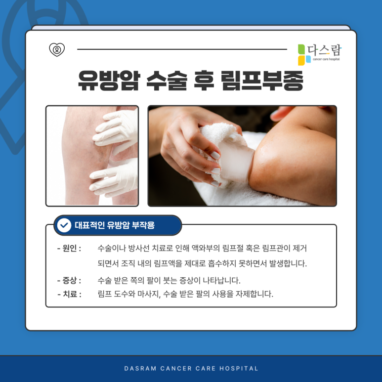 수술을 받은 쪽의 팔이 붓는 증상이 나타나며, 림프부종이 발생하지 않도록 수술을 받은 팔을 되도록 사용하지 않는 것이 좋지만, 이미 발생했다면 파주요양병원 다스람요양병원에서 림프도수와 같은 통증 치료를 통해 증상 완화를 기대해볼 수 있습니다.