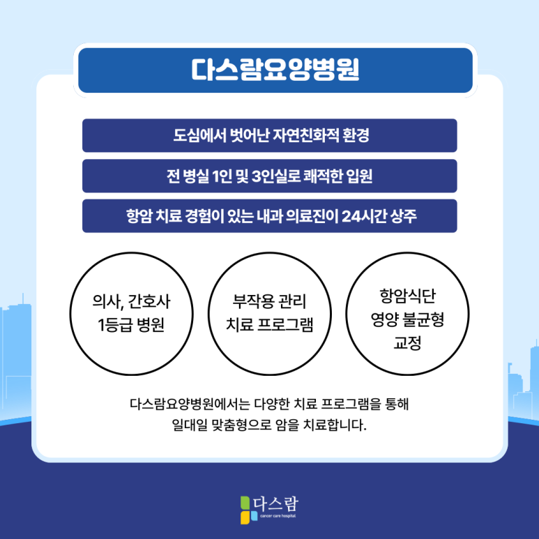 간병의 무게를 덜고 싶다면, 환자와 가족 모두가 잠시 숨을 고르고, 체계적인 도움을 받을 수 있는 암 요양병원을 고려해보는 것도 하나의 방법입니다. 중요한 건 삶을 끝까지 ‘살아내는’ 힘을 되찾는 것이니까요.