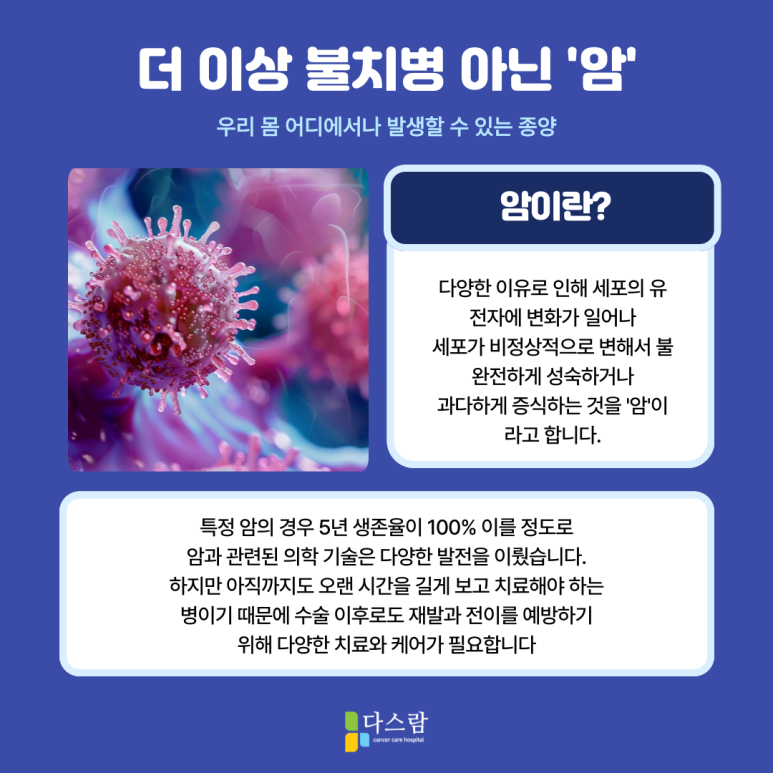 오늘 일산암요양병원 다스람요양병원에서는 암이라는 질병에 대한 기본적인 이해부터 표준 치료, 회복의 필요성, 그리고 통합적인 치료 방안까지 단계별로 풀어보고자 합니다. 왜 암 요양병원이 필요한지, 그 속에서 어떤 가치가 있는지를 함께 살펴보겠습니다.