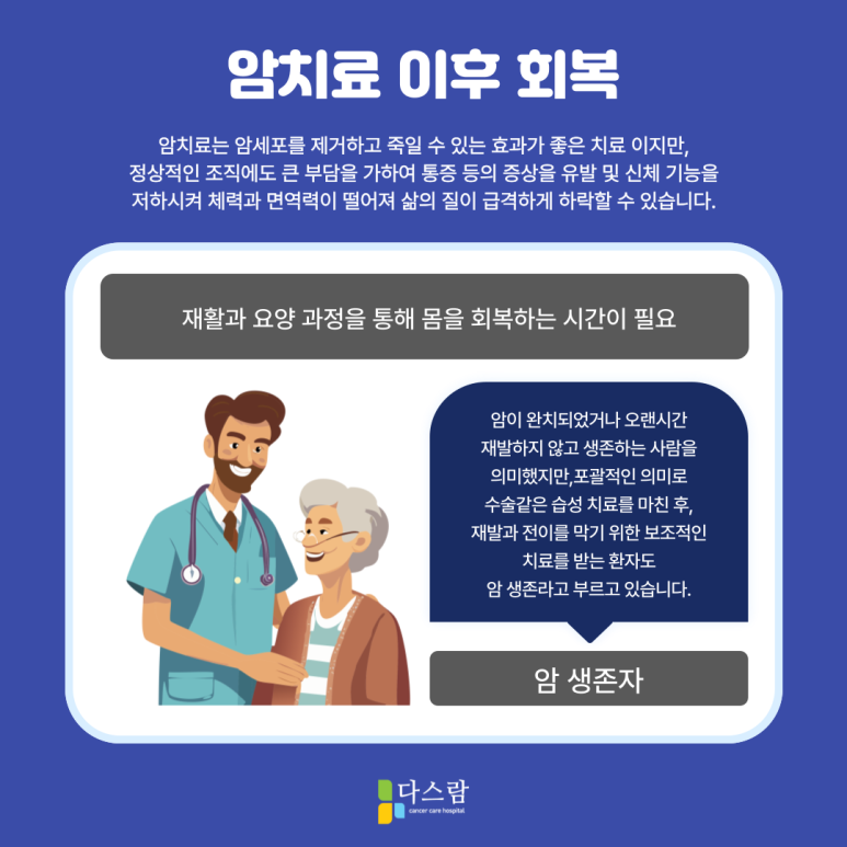 수술 부위의 회복, 항암치료로 인한 면역력 저하, 장기 기능 저하, 영양 불균형, 체력 저하, 불면증, 우울감 등 치료 후 나타나는 다양한 후유증과 삶의 질 저하가 본격화되죠.