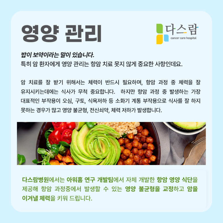 암 환자들에게 항암 치료 못지않게 중요한 사항은 영양 관리입니다. 암 치료를 잘 받기 위해 체력이 필요하며, 항암과정 중 체력을 유지하기 위해서는 식사가 무척 중요한데요. 하지만 항암의 대표적인 소화기 계통 부작용으로 식사가 어려울 수 있고, 영양 불균형이나 전신 쇠약, 체력 저하가 발생합니다.