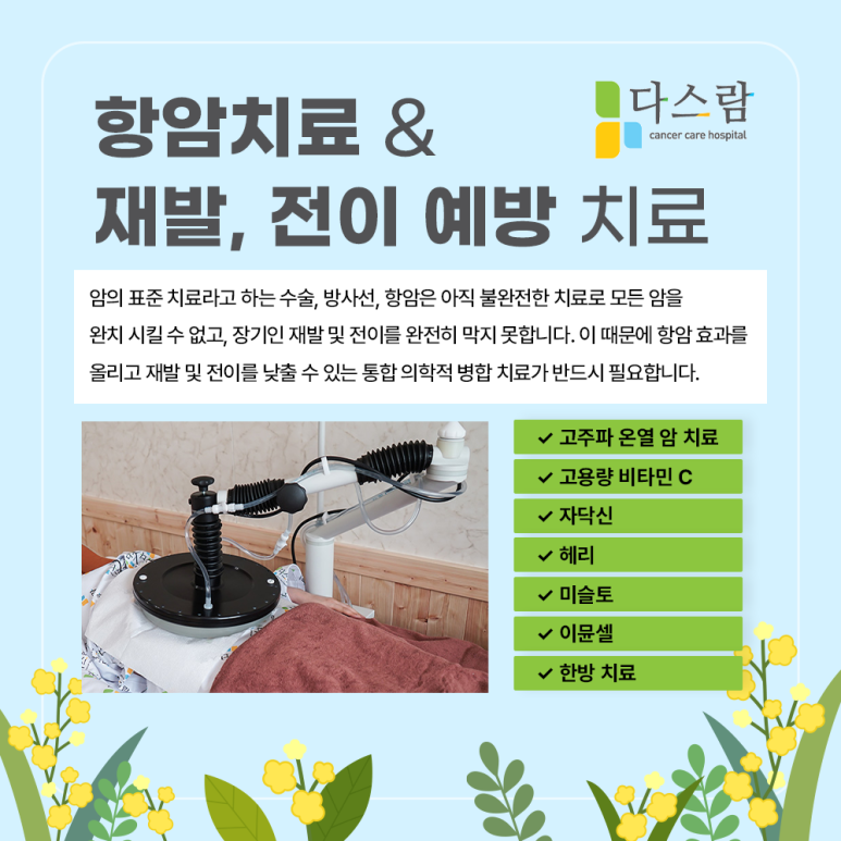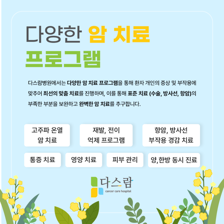 현재 표준치료라고 보고 있는 양방 요법은 완전하지 않아 부작용과 장기적인 재발을 막을 수 없는데요. 다스람 병원에서는 양방치료와 함께 한의학적 방법으로 몸의 상태를 개선해 효과적인 암 치료가 될 수 있도록 도와드리고 있습니다.