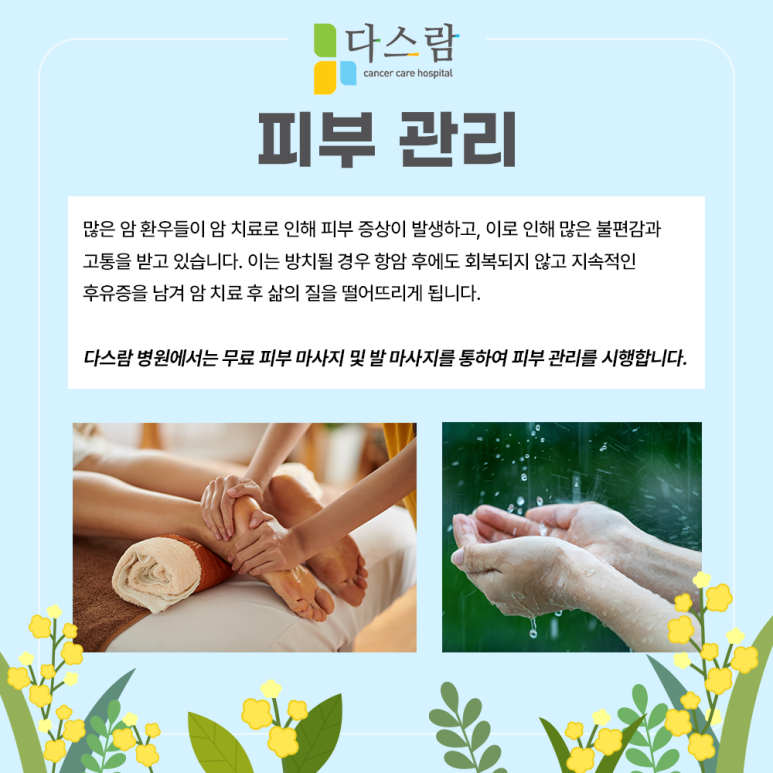 많은 암 환우들은 암치료로 인한 피부 증상으로 많은 불편감과 고통을 받고 있습니다. 이를 방치하면 항암 후 지속적인 후유증으로 남을 수 있는데요. 다스람병원에서는 무료 피부 마사지 및 발 마사지로 피부 관리를 시행합니다.