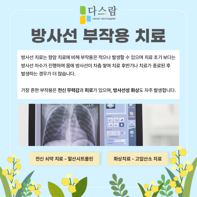 방사선 치료는 항암 치료에 비해 부작용은 적지만, 치료 초기보다는 방사선 차수가 진행하면 몸에 방사선이 차츰 쌓일 수 있어 치료 후반 혹은 치료 종료 후에 부작용이 발생할 수 있습니다.