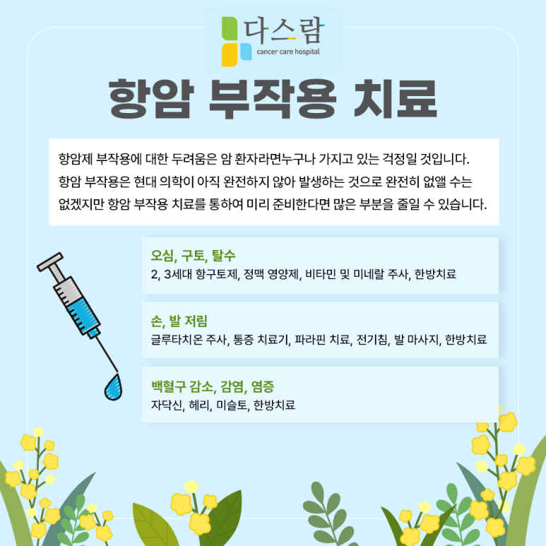 항암 부작용에 대한 두려움은 암 환자라면 누구나 가지고 있는 걱정이며, 항암 부작용은 현대 의학의 부족함으로 완전하게 없앨 수는 없지만, 항암 부작용 치료를 통해 미리 준비해 많은 부분을 줄일 수 있습니다.