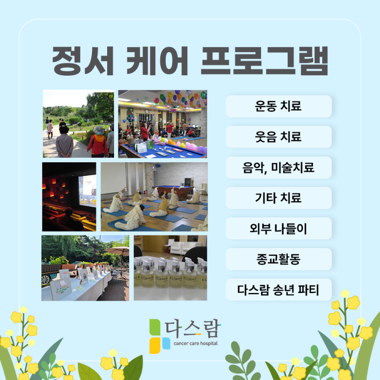 다스람병원에서는 운동치료와 웃음 치료, 음악, 미술치료 같은 정신적인 치료는 물론, 퀼트나 뜨개질, 외부 나들이나 종교활동, 송년 파티처럼 일상생활과 다름없는 생활로 즐거움을 느끼실 수 있도록 도와드리고 있습니다.