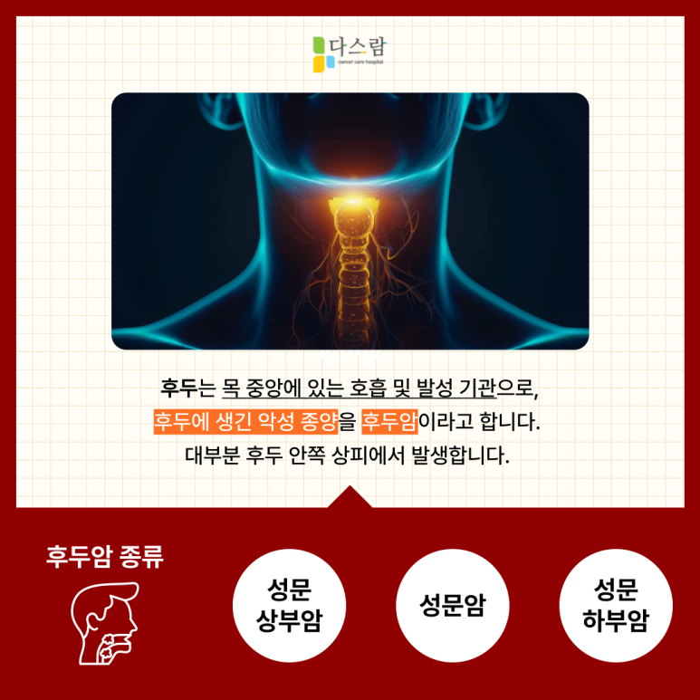 1. 상부후두암(서문상부암): 후두의 윗부분, 혀뿌리와 성대 사이에 위치한 부위에서 발생합니다. 통증과 함께 이물감, 삼킴 곤란, 귀로 통증 전달 등의 증상이 나타날 수 있습니다.