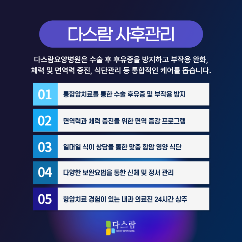 - 영양 요법: 항암 치료 중 식욕 부진이나 영양 불균형을 예방하기 위한 관리도 매우 중요합니다. 적절한 식이 조절은 면역력 회복과 체력 유지에 큰 역할을 합니다.