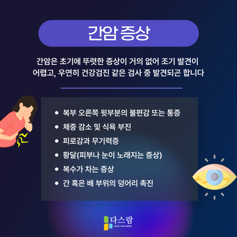 문제는 간이 매우 참을성이 좋은 장기라서, 암이 상당히 진행될 때까지도 자각증상이 거의 없다는 점입니다. 평소 건강검진을 소홀히 한다면, 증상이 나타났을 땐 이미 치료가 쉽지 않은 단계일 수 있습니다.