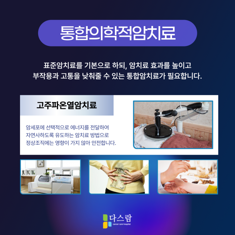 - 고주파 온열암치료: 고주파를 이용해 국소적으로 열을 가해 암세포를 약화시키는 치료입니다. 암세포는 열에 약하다는 점을 이용한 방법으로, 다른 치료법과 병행해 시행되기도 합니다.