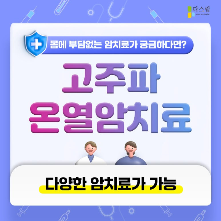 이에 도움이 되는 대표적인 치료법으로 고주파온열암치료가 있습니다. 열을 이용한 암환자 맞춤 치료법으로, 수술이나 항암, 방사선 치료 이후 면역력 회복에 효과적이라고 볼 수 있습니다. 다스람요양병원은 고주파온열치료에 경험이 풍부한 의료진이 상주해있으니 파주암요양병원을 찾고 계시다면 믿고 상담하러 오시길 바랍니다.
