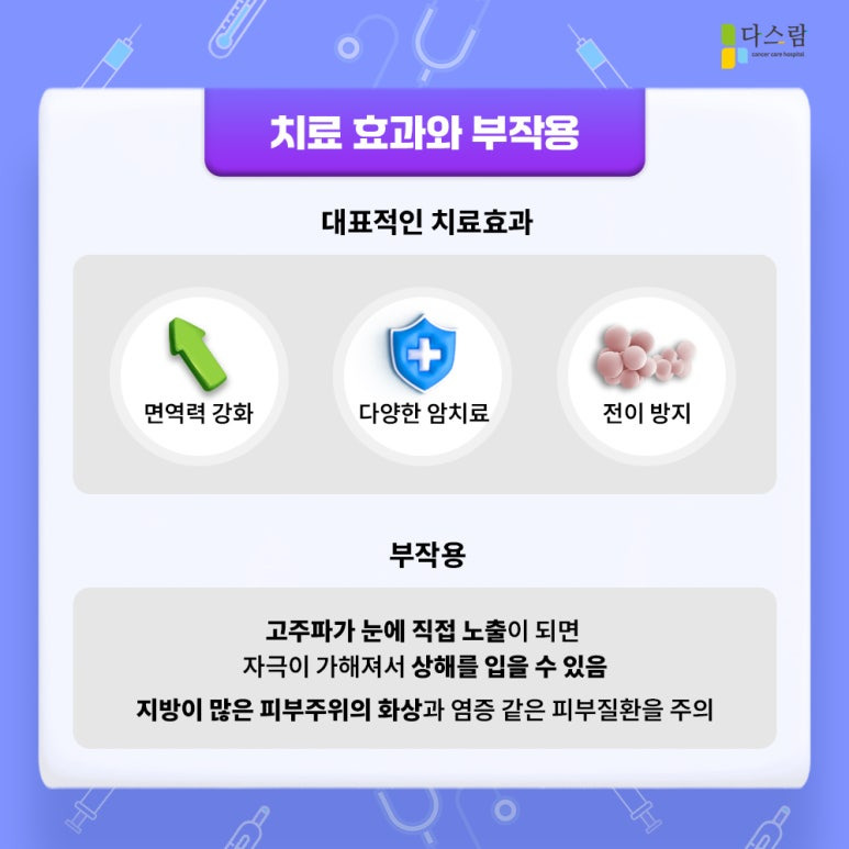암치료는 암세포 제거를 위한 치료로 제한하는 것이 아니라, 치료 이후 환자의 삶을 개선시킬 수 있는 통합적인 관리로 생각해야 합니다. 환자의 전신 면역력과 전반적인 삶의 질 향상을 고려한다면 고주파온열암치료는 필수적이라고 말해도 과언이 아닙니다.