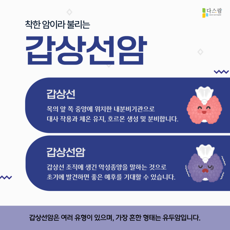 이번 일산암재활병원 다스람요양병원 포스팅에서는 갑상선암의 정의와 원인, 진단 방법 그리고 수술 전후의 식이요법에 대해 알아보겠습니다.