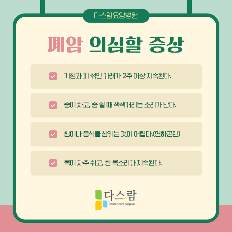 폐암 수술 후에는 폐기능이 저하되는 것이 자연스럽고, 이를 회복하기 위해서는 꾸준한 관리가 필요합니다. 기침을 유발하는 자극 물질을 피하고, 간접 흡연의 환경에서 벗어나는 것이 좋아요. 폐암 치료 후 관리가 필요하다면 다스람요양병원에 내원해 상담 받아보시는 것을 추천드립니다.