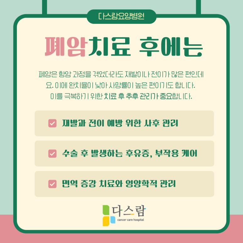 폐암 수술 후 통증 관리는 물론 후유증이나 부작용 케어, 떨어진 면역력과 체력 증진을 위한 면역 증강 치료와 영양학적 관리가 필요할 수 있으며, 다스람요양병원에서는 다음의 관리를 도와드릴 수 있습니다.