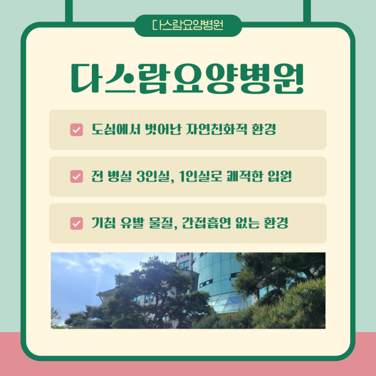 또한 다스람요양병원에는 도심에서 살짝 벗어난 곳에 위치하고 있어 미세먼지와 대기 오염과 조금은 떨어진 환경이라고 볼 수 있는데요. 병원 근처에는 공원과 산에 있는 나무를 통해 깨끗한 공기를 맡을 수 있으며, 전 병실이 3인실과 1인실로 구성되어 있어 쾌적한 입원 생활을 하실 수 있습니다.
