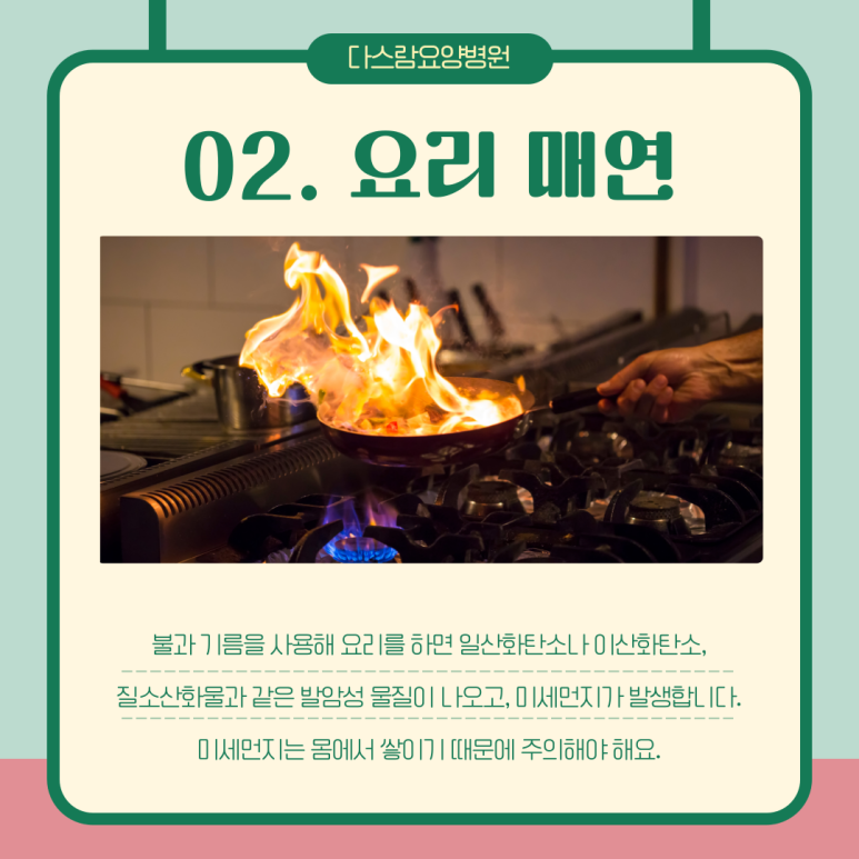 : 요리를 할 때는 불을 사용하고, 특히 기름을 사용해 굽거나 튀기는 요리를 많이 하게 되는데요. 이 과정에서는 일산화탄소나 이산화탄소, 질소산화물같은 발암성 물질이 나오고, 미세먼지가 발생합니다. 이러한 물질은 입자가 작기 때문에 우리 몸에 흡수되는 과정에서 걸러지지 않고 폐포 말단에 도달해 쌓일 수 있어요.