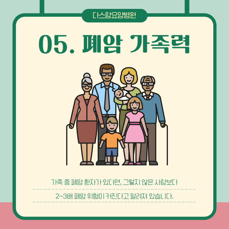 : 가족 중 폐암 환자가 있다면, 그렇지 않은 사람보다 2~3배 폐암 위험이 커진다고 알려져 있습니다.