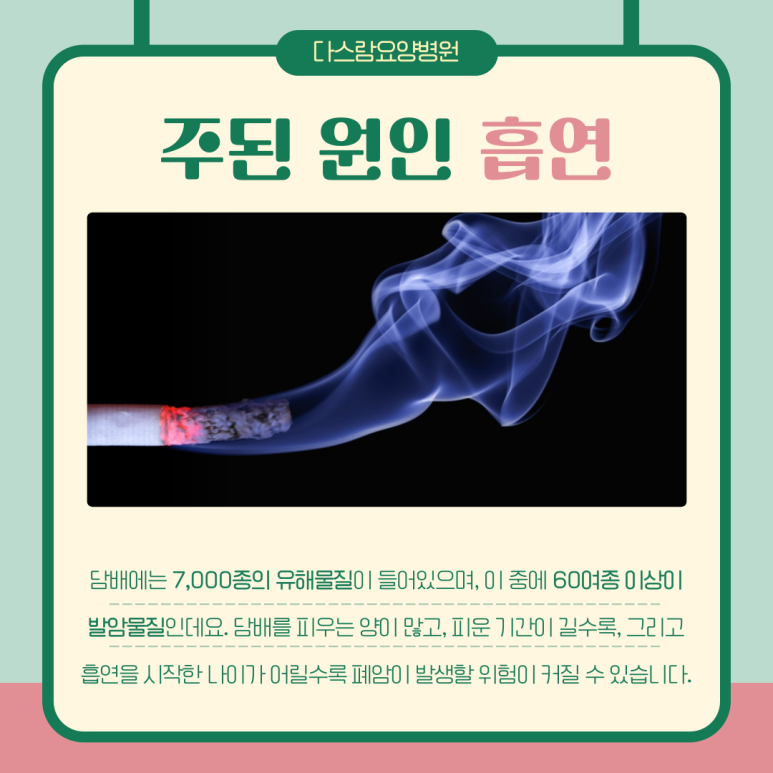담배에는 7,000여 종의 유해물질이 들어있으며, 이 중에 60여종 이상이 발암물질인데요. 따라서 담배를 피우는 양이 많고, 피운 기간이 길어질수록, 그리고 흡연을 시작한 나이가 어려질수록 폐암이 발생할 위험이 커질 수 있습니다.