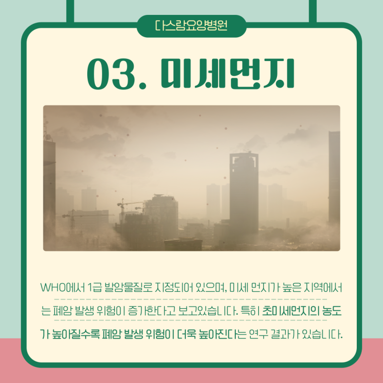 : 미세먼지는 WHO에서 1급 발암물질로 지정되어 있으며, 미세 먼지가 높은 지역에서는 폐암 발생 위험이 증가한다고 보고 있습니다. 특히 초미세먼지의 농도가 높아질수록 폐암 발생 위험이 더욱 높아진다는 연구 결과도 보고되었죠. 자동차 배기가스나, 난방, 산업 활동에 의해 배출될 수 있으며, 요리를 할 때 특히 기름이 나오는 요리를 할 때는 미세먼지 농도가 10배 이상 높아져 주의가 필요합니다.