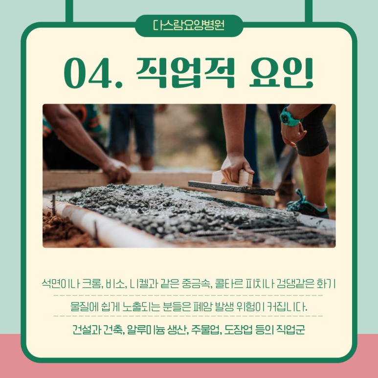 : 석면이나 크롬, 비소, 니켈과 같은 중금속, 콜타르 피치나 검댕같은 화기 물질에 쉽게 노출되는 분들은 폐암 발생 위험이 커집니다. 건축이나, 알루미늄 생산, 주물업, 도장과 같은 특정한 직업군에게 해당되겠죠.