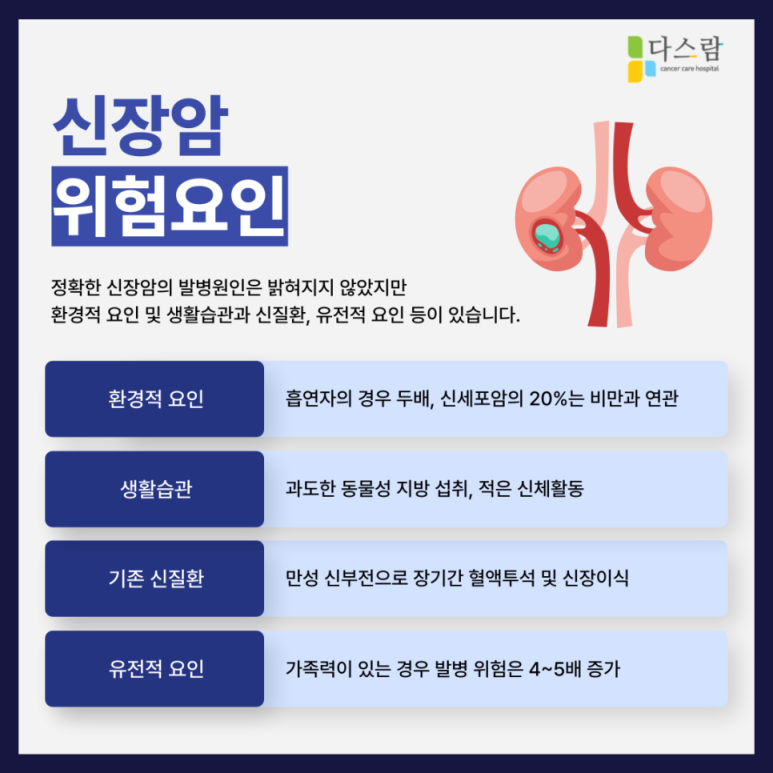 가족 중 신장암 병력이 있는 사람은 유전 질환이 없더라도 암 발병 위험은 높아집니다. 특히 형제자매 중 신장암 환자가 있는 경우 위험이 가장 높습니다.