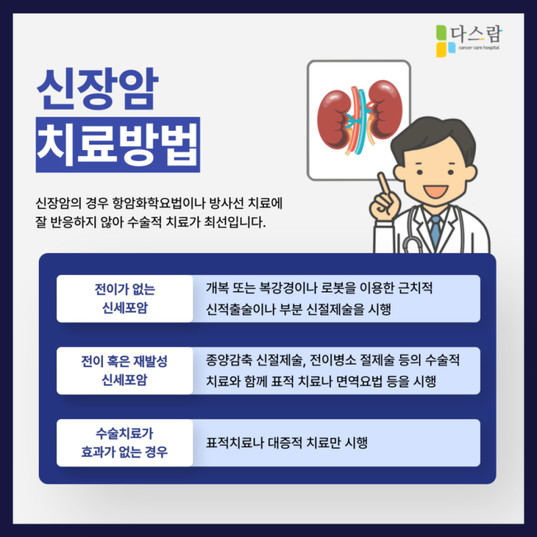 신장암 수술은 국소 신장암의 핵심 치료입니다. 수술 후의 보조 면역치료도 재발 감소에 효과가