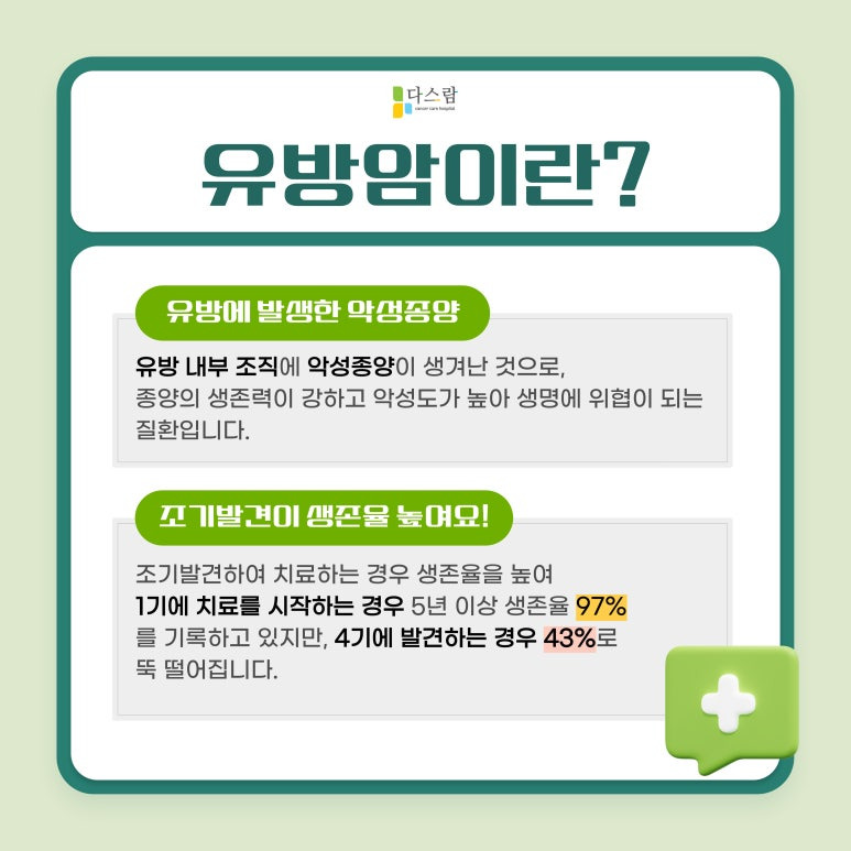 유방에 생기는 악성 종양으로, 대부분은 젖을 운반하는 관인 유관이나 젖을 생성하는 부분인 소엽에서 시작됩니다. 여성에게 가장 흔한 암 중 하나이며, 드물지만 남성에게도 발생할 수 있습니다. 대부분 40세 이상 여성에서 발생하며 30대 이하의 유방암은 드물지만 더 공격적인 형태일 수 있습니다. 주로 림프절, 폐, 간, 뼈, 뇌로 전이되는 형태를 보입니다.