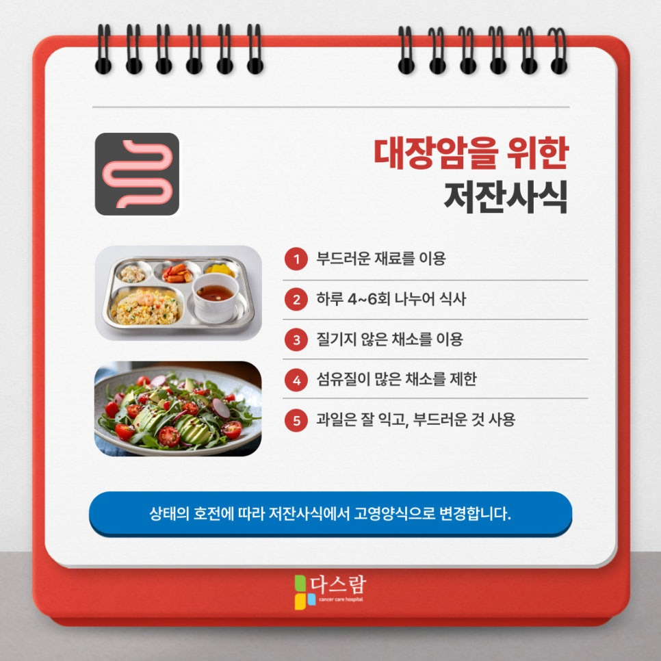 대장암 환자에게 가장 어려운 것 중 하나는 바로 식사 조절인데요. 일반적인 암환자와 달리 장 절제 수술 이후에는 소화 흡수 능력이 급격히 떨어지기 때문에 단순한 저자극식이 아닌 환자 개인의 상태에 맞는 식단이 필요한 경우도 생기게 되요, 때문에 암요양병원에서는 이러한 환자의 특성에 맞는 암환자 식단을 제공함으로서 환자의 식단관리에도 힘을 쓰는 것이 일반적이에요.