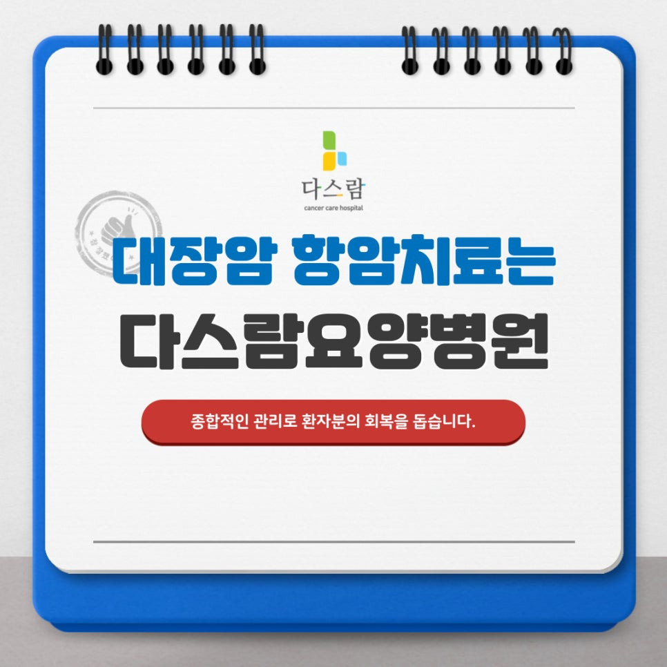 일산 다스람요양병원은 의료진의 숙련도, 시설의 전문성, 회복 프로그램의 완성도 어느 하나 빠지지 않는 대장암 특화 요양병원으로서, 환자 한 명 한 명의 상태에 따라 ‘맞춤 회복 플랜’을 제공하고 있으니 믿고 안심하시고 방문하시면 좋을것 같아요.