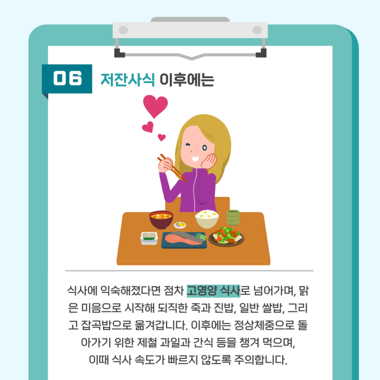 회복이 진행되면, 섭취 칼로리와 단백질을 늘려 체중 회복에 신경 써야 합니다. 또한, 식사는 천천히 꼭꼭 씹어 드셔야 장에 무리가 가지 않습니다.