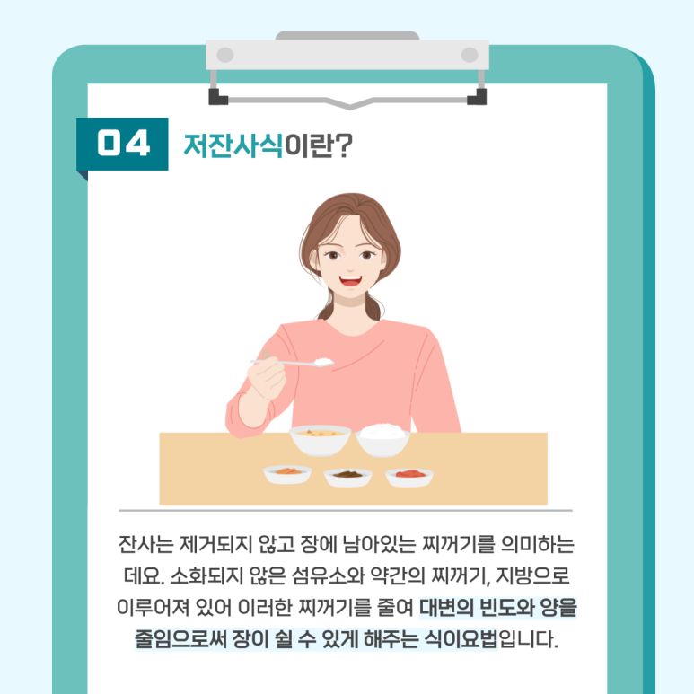 이러한 증상은 시간이 지나며 호전되지만, 수술 직후 장의 회복을 돕기 위한 식단이 필요하며, 그 중심에 바로 저잔사식단이 있습니다.