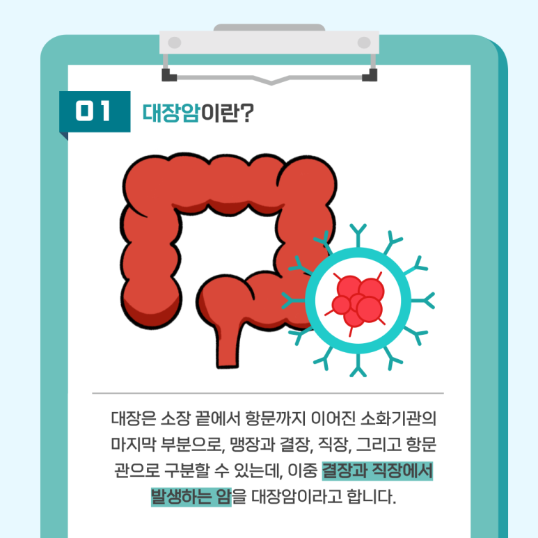 대장은 소장 끝에서 항문까지 이어지는 소화기관의 마지막 구간으로, 맹장·결장·직장·항문관으로 나뉩니다. 이중 결장과 직장에 발생하는 암을 통틀어 대장암(결장직장암)이라고 부릅니다.