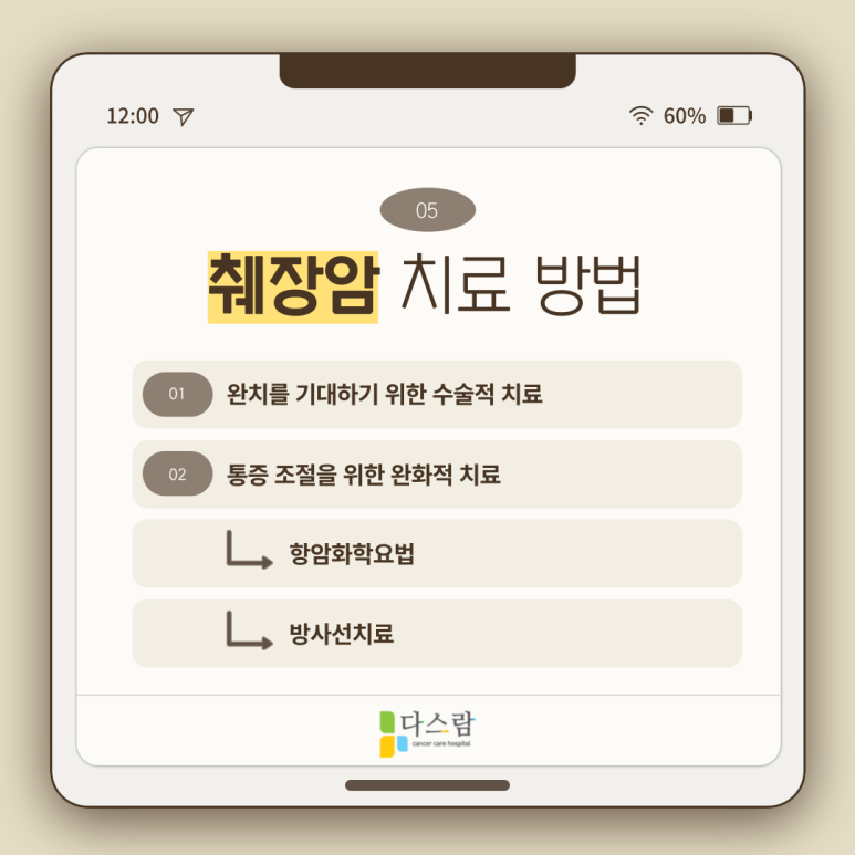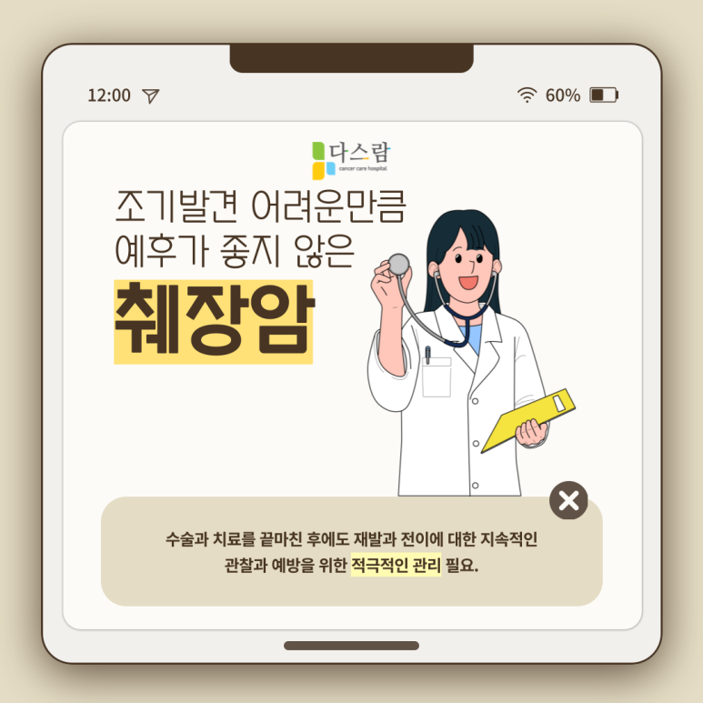무엇보다 암을 이겨내기 위해 필요한 것은 적극적인 마음가짐입니다. 췌장암은 특히 초기 발견이 어려운 암종 중 하나이기 때문에, 늦게 발견하였다고 해 낙담하고, 자책할 수 있는데요. 부정적인 마음보다는 암을 완치할 수 있다는 굳은 의지로 맞서 싸우는 것이 중요합니다.