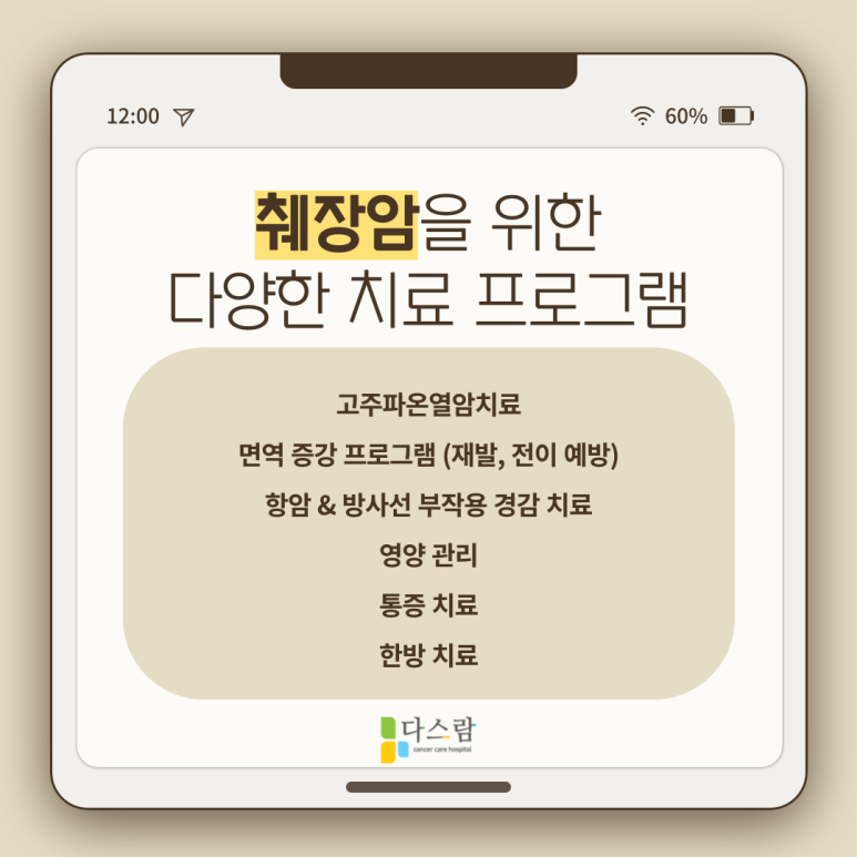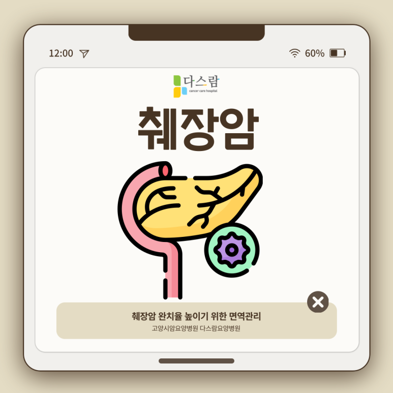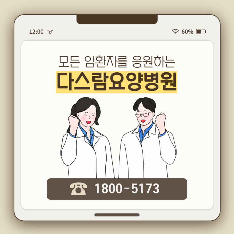 고양암요양병원 다스람요양병원에서는 이러한 췌장암 환우 분들을 위한 맞춤 식단을 제공하고 있으며, 치료 후 나타나는 부작용과 합병증에 대응하기 위한 다양한 치료 프로그램을 시행합니다.