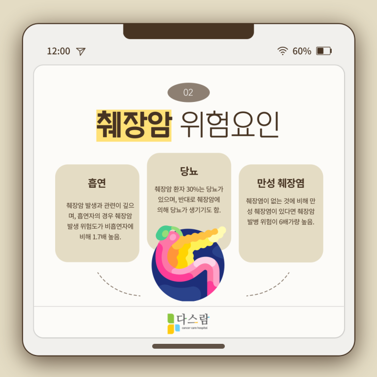 ◈ 만성췌장염 : 췌장염이 없는 경우에 비해 만성 췌장염이 있다면 췌장암 발병 위험이 6배가량 높아집니다.
