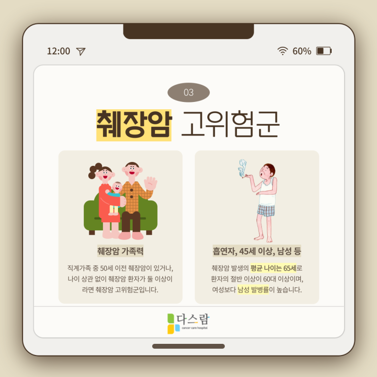 이처럼 췌장암의 특히 초기 증상은 비특이하여 자각하는 데에는 굉장한 어려움이 따릅니다. 따라서 췌장암 가족력이 있거나, 만성 췌장염, 당뇨, 흡연 등 본인이 고위험군에 속한다면 주기적으로 췌장 검사를 시행하는 것이 바람직하겠죠. 췌장암을 예방하고, 조기에 발견하여 생존율을 높이기 위한 가장 좋은 방법이기도 합니다.