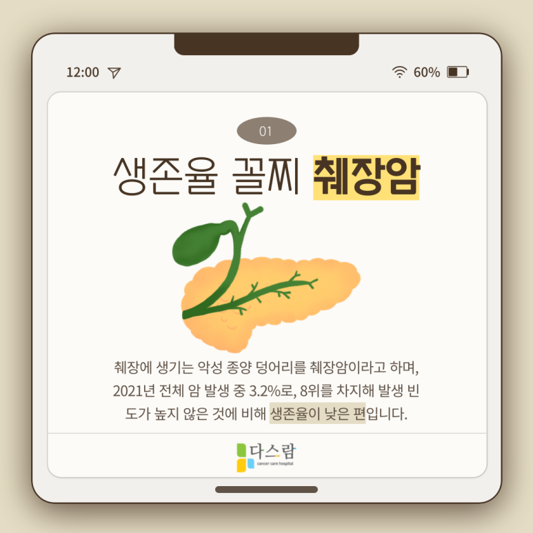 2021년 국가암등록통계 발표에 의하면 암환자 5년 상대생존율은 72.1%로, 10년 새에 6.6%p 높아졌다고 하는데요. 그럼에도 생존율이 높지 않아 무섭고 골치 아프다고 평가되는 암이 있는데, 바로 췌장암입니다.