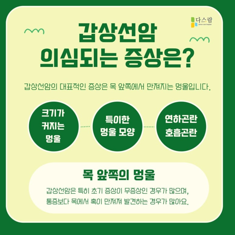 문제는 갑상선암이 초기에는 거의 증상이 없다는 점입니다. 그래서 정기검진이 매우 중요합니다. 하지만 병이 진행되면서 다음과 같은 신호가 나타날 수 있습니다.