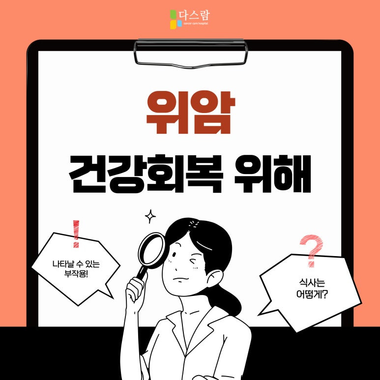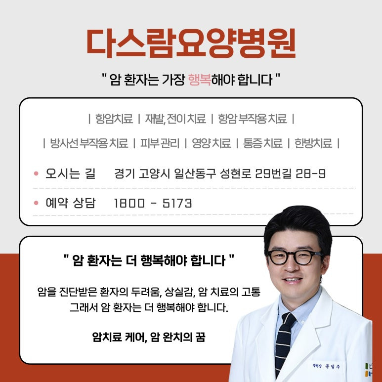 만약 위암 초기증상이 의심되거나, 수술 후 체계적인 관리를 고민하고 있다면 경기도암재활병원 다스람요양병원을 방문해보세요. 다스람요양병원은 위암 환자의 특성과 회복 과정을 고려해 맞춤형 치료와 영양관리, 재활 프로그램을 제공하며 환자 개개인의 빠른 회복을 돕고 있습니다. 당신의 건강한 회복, 다스람요양병원이 함께합니다.