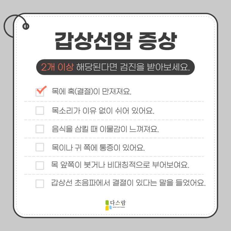 갑상선암은 초기에 특별한 증상이 없는 경우가 더 많아요. 그래서 더욱 조기 검진이 중요합니다. 갑상선암이 진행되면 다음과 같은 증상이 나타날 수 있어요.