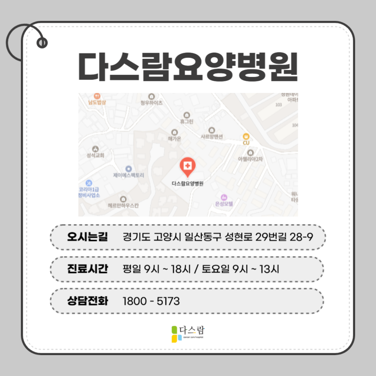 갑상선암 수술 후 지친 몸과 마음을 치유하고 싶어 일산암요양병원을 찾고 계시다면 다스람요양병원과 상담해보세요.