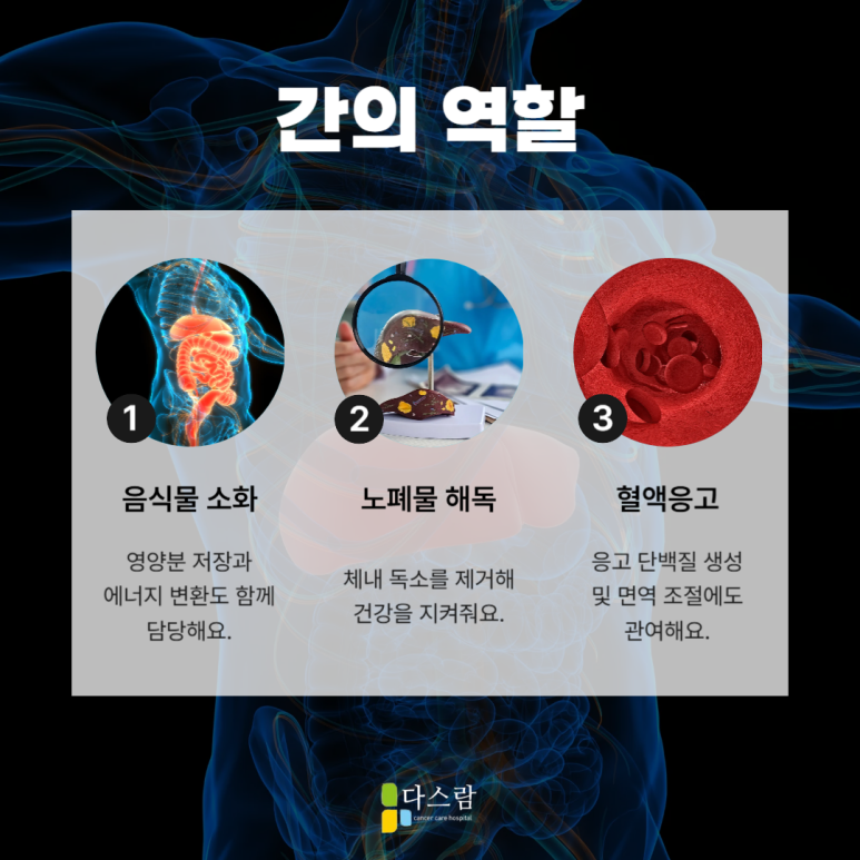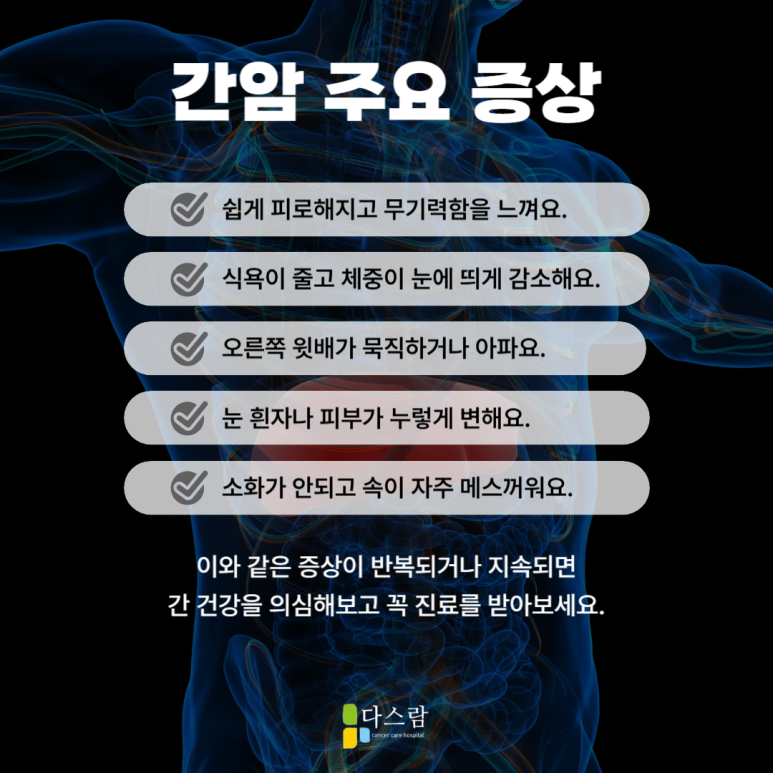 하지만 이처럼 다양한 일을 하는 간에 암이 생기면 그 기능들이 점차 무너집니다. 간암이 진행될수록 체내 독소가 해독되지 않고 쌓이게 되어 피로감, 황달, 복수, 소화장애 등이 나타날 수 있어요. 또한 간 기능 저하로 인해 면역력이 떨어지고 감염에도 취약해질 수 있습니다. 결국 일상생활 자체가 어려워질 수 있기 때문에 조기 진단과 적절한 치료가 꼭 필요합니다.