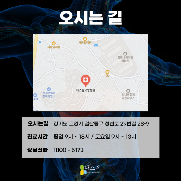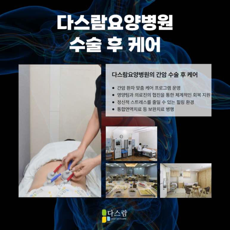 파주암치료병원 다스람요양병원은 단순한 입원 치료를 넘어 간암 환자의 회복과 삶의 질 개선을 동시에 도와드립니다. 수술 후 지친 몸과 마음을 조금 더 편하게 돌볼 수 있는 공간이 필요하시다면 파주암치료병원인 다스람요양병원을 고민해보세요.