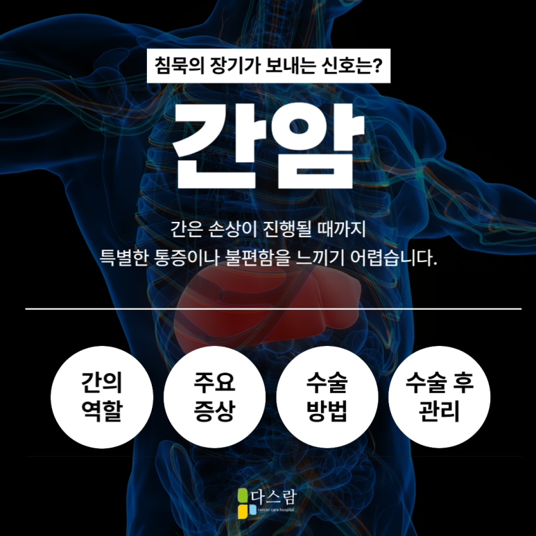 오늘은 파주암치료병원 다스람요양병원과 함께 간암의 원인, 증상, 수술 방법, 수술 후 케어 방법까지 자세히 알아보도록 하겠습니다.