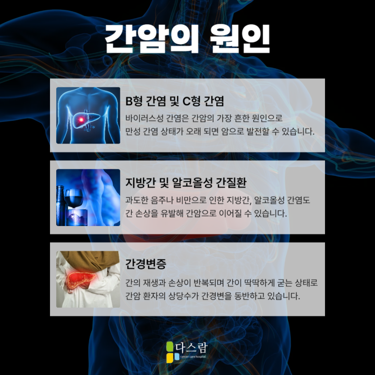 간암 간세포에 악성 종양이 발생하는 질환이에요. 대부분 B형 또는 C형 간염 바이러스에 장기간 감염되면서 간경변증으로 진행되고 이 간경변이 오래 지속될수록 간암 발생 가능성이 높아집니다. 또 바이러스 감염 외에도 과도한 음주, 비만, 당뇨병, 유전적 요인 등이 간세포에 지속적인 손상을 주어 암으로 이어질 수 있어요.