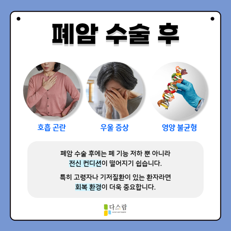 폐암 수술 후에는 폐 기능 저하뿐 아니라 전신 컨디션이 떨어지기 쉬워요. 특히 고령자나 기저질환이 있는 환자라면 회복 환경이 더욱 중요합니다.