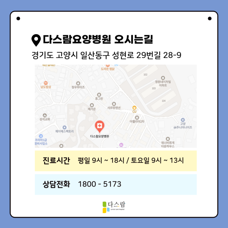 일산에 위치한 다스람요양병원은 암환자를 위한 맞춤형 케어 시스템을 구축하고 있는 암환자요양병원입니다. 폐암 환자에게 특히 필요한 통합관리 시스템을 운영 중이에요.