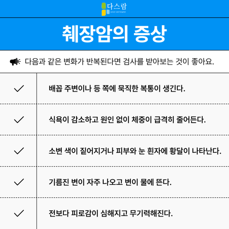 췌장암은 자가진단만으로 확인하기 어렵지만 아래에 해당된다면 정밀검사를 고려해보는 것이 좋습니다.